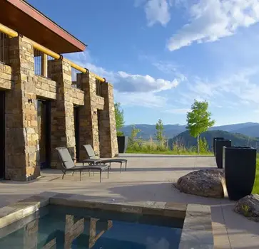 Indoor/outdoor lounging spaces designed with redwood, sandstone, and regional artisan elements